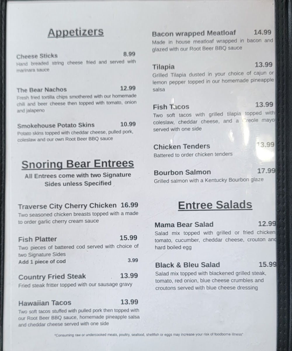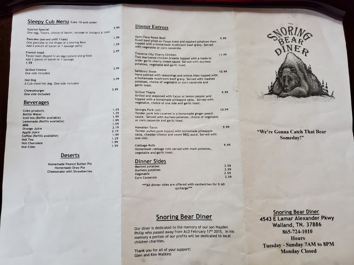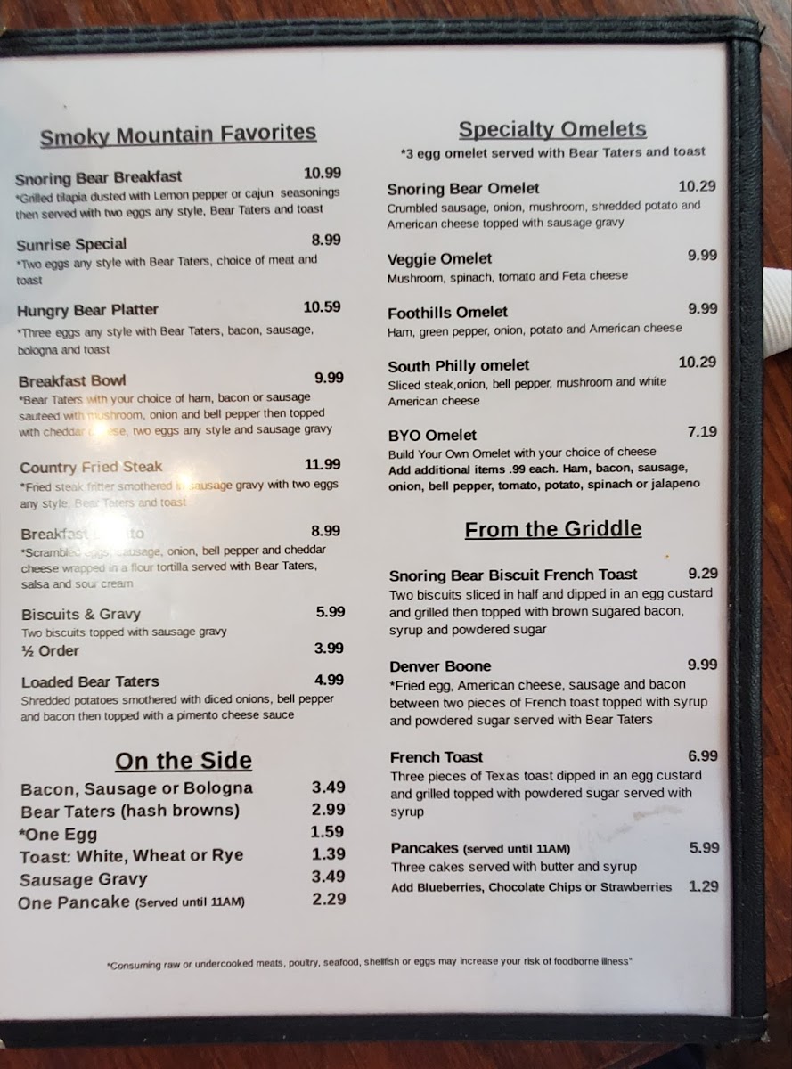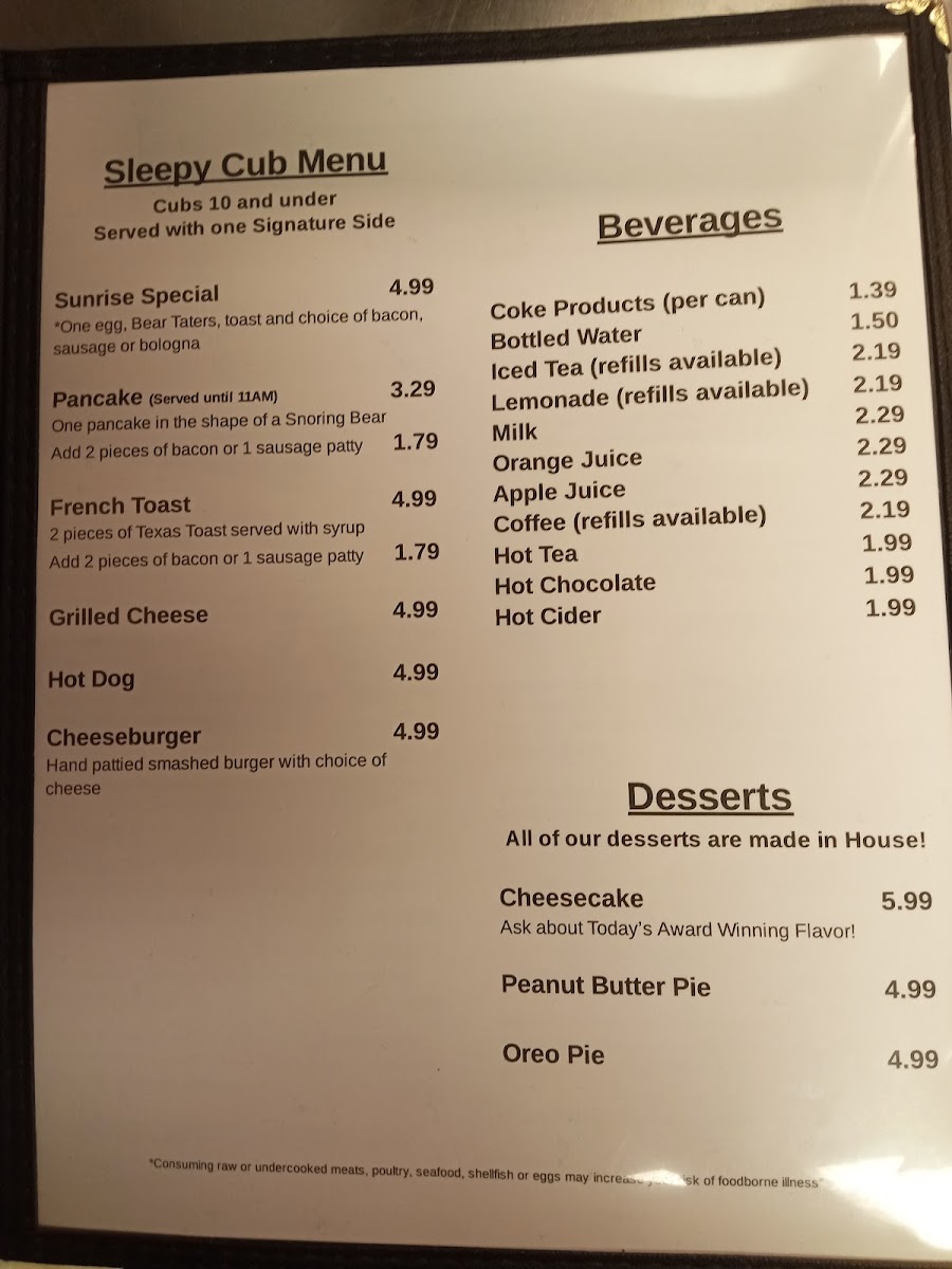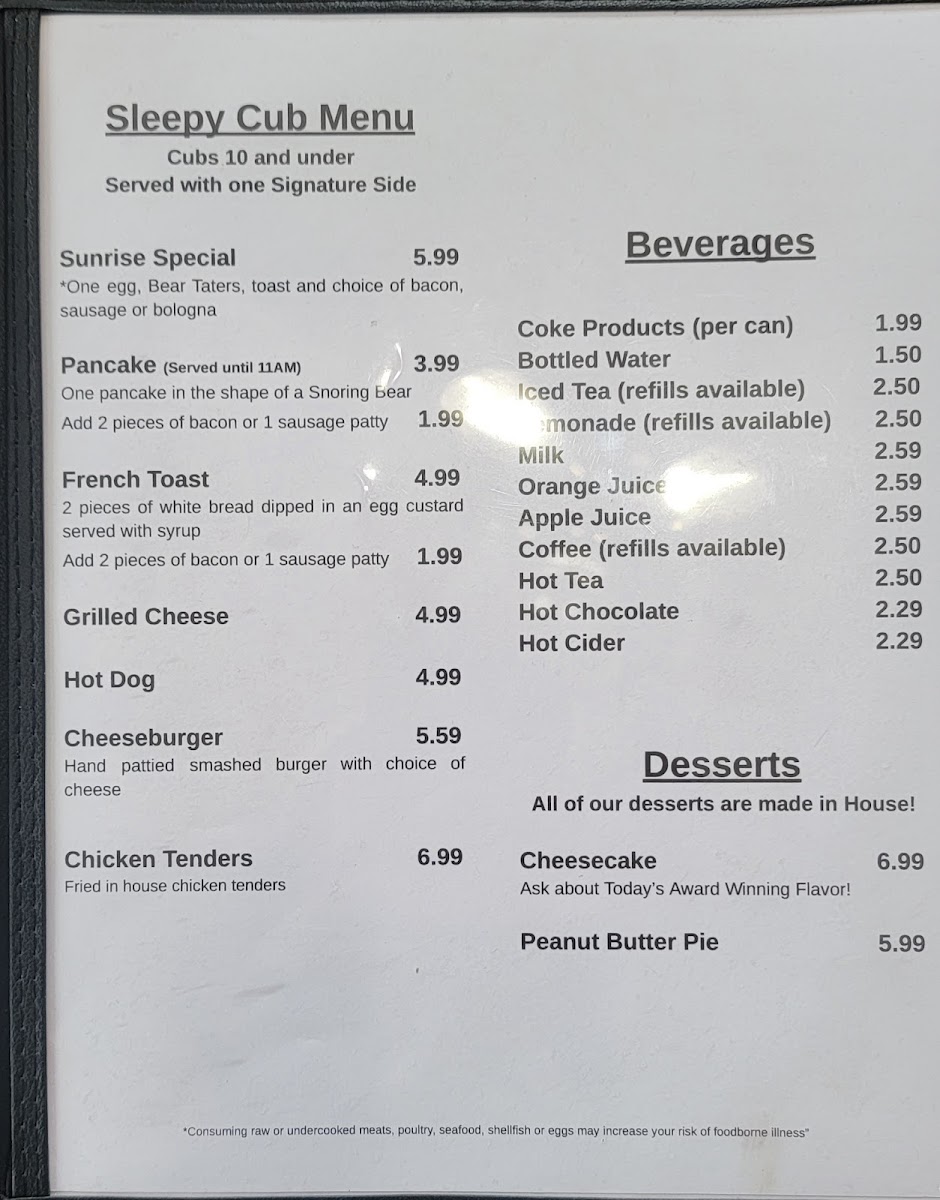Discover the delightful flavors waiting for you at Snoring Bear Diner! Join us for a cozy meal filled with mouthwatering dishes that will satisfy your cravings and warm your heart. Come experience our friendly atmosphere and let us serve up a memorable dining experience you won't want to miss!